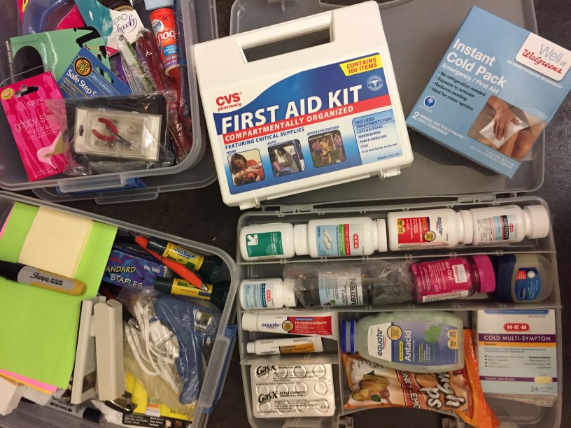 So, what is an emergency kit? It is a variety of items useful in an emergency that are kept together and can be accessed quickly. An emergency kit could be as simple as a first aid kit in a small box or as complex as a first aid kit, a tool kit, AND an office supply kit, all organized into plastic storage bins with corresponding labels and an inventory list.
