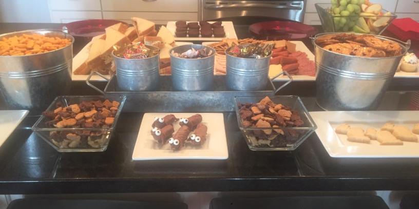 Accessibility was important, and Sandra arranged the food on an island (great for buffets) with low-sided plates in front and taller metal pails in the center. This multi-leveled display is visually appealing, and it also helps small hands avoid knocking over taller dishes while reaching for another dish. Smart mom, huh? By the way, the adorable metal pails are from Amazon and are another great way to carry the canine theme through the food display.
