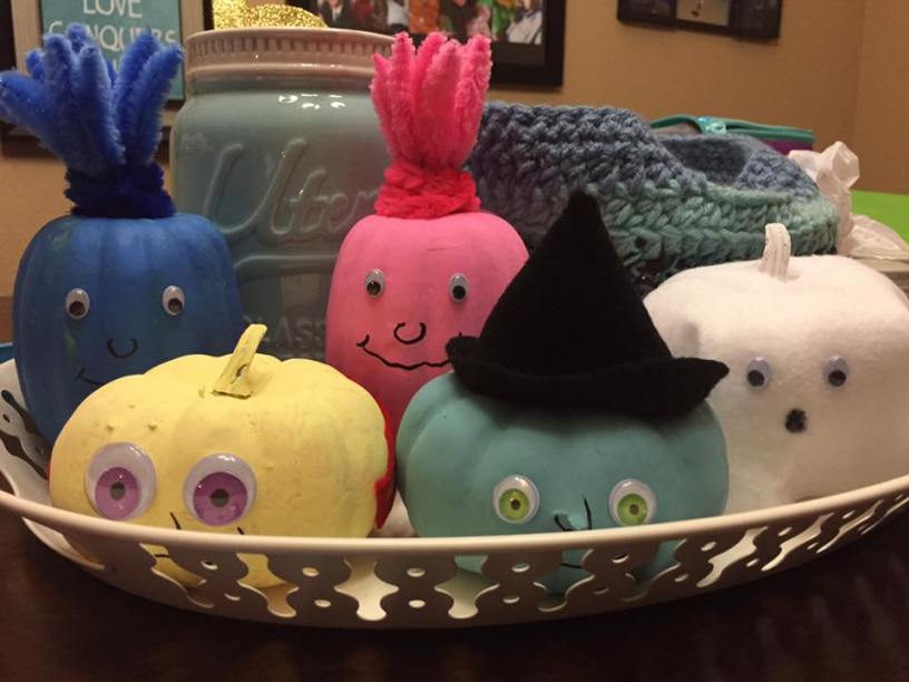 You did it! If you’re feeling pretty confident after the first pumpkin, you can branch out and try painting your pumpkins in different colors for even more bang. I recommend acrylic paint as it gives a good coat to cover whatever color the pumpkin actually is. (Don’t forget to figure in drying time for the paint *before* you start drawing on the face or applying accessories.) My daughter and I had the silly idea to put costumes on our pumpkins, too, so you can see below Poppy and Branch from the Trolls movie (the pink and blue ones with chenille stems for crazy hair), a witch with a felt hat, a superhero with a tiny red cape, and a startled ghost. She giggles every time she sees them.
