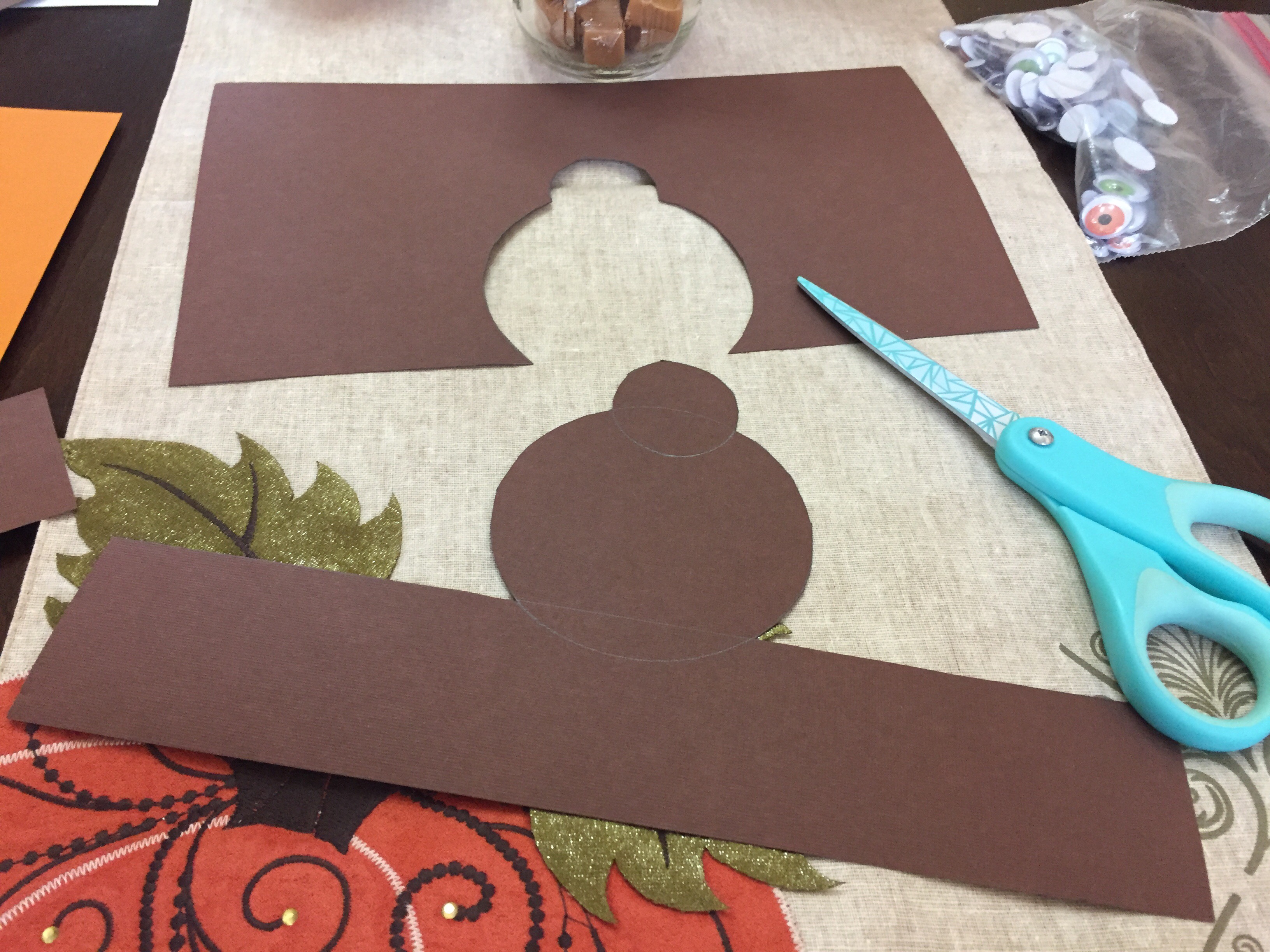 TIP: Don’t bother freehand drawing the circles; just find something round and trace it. I used the ribbon roll for the body and a glue stick for the head. It’s easier and faster and gives you more consistently sized turkeys.