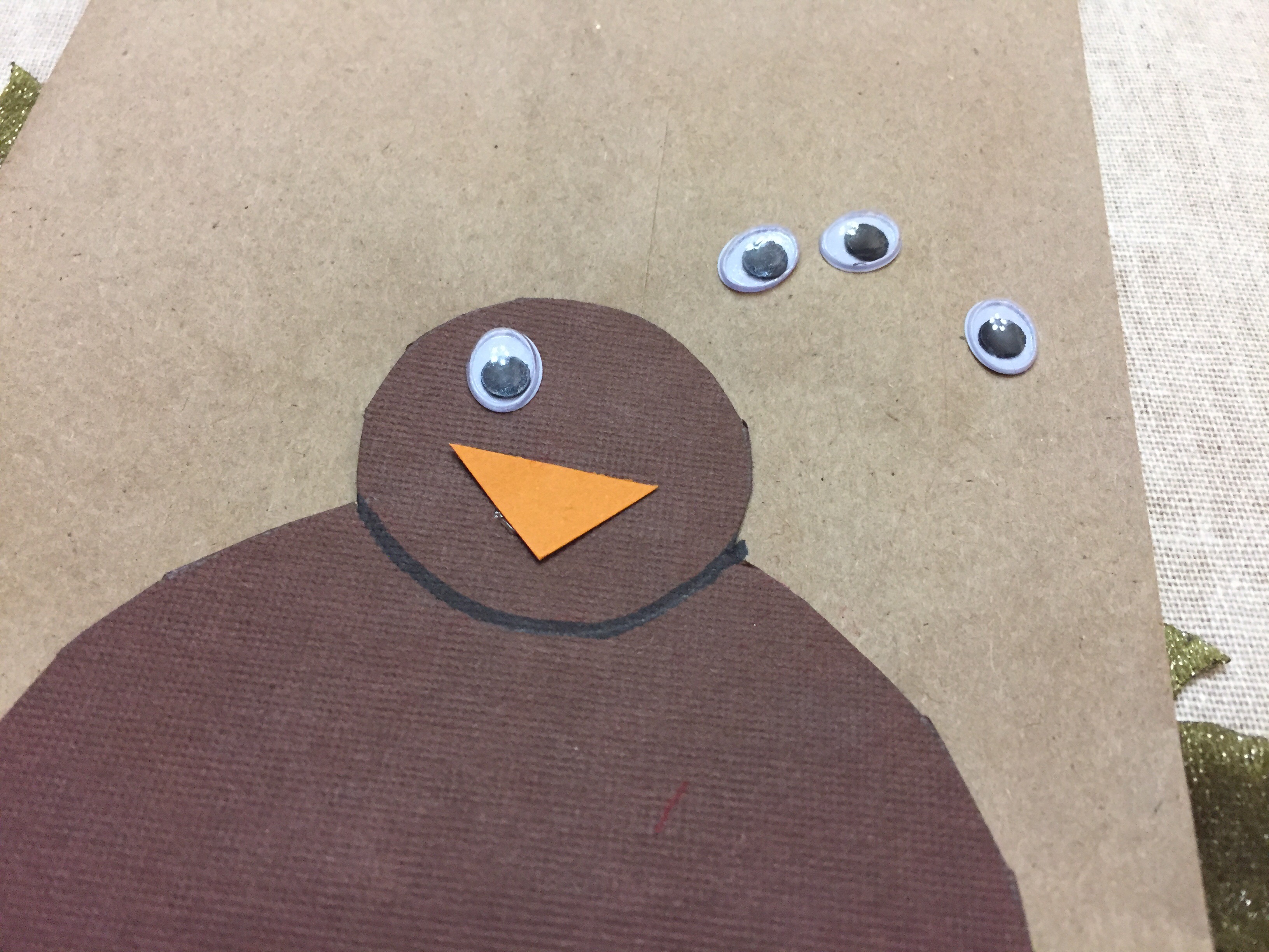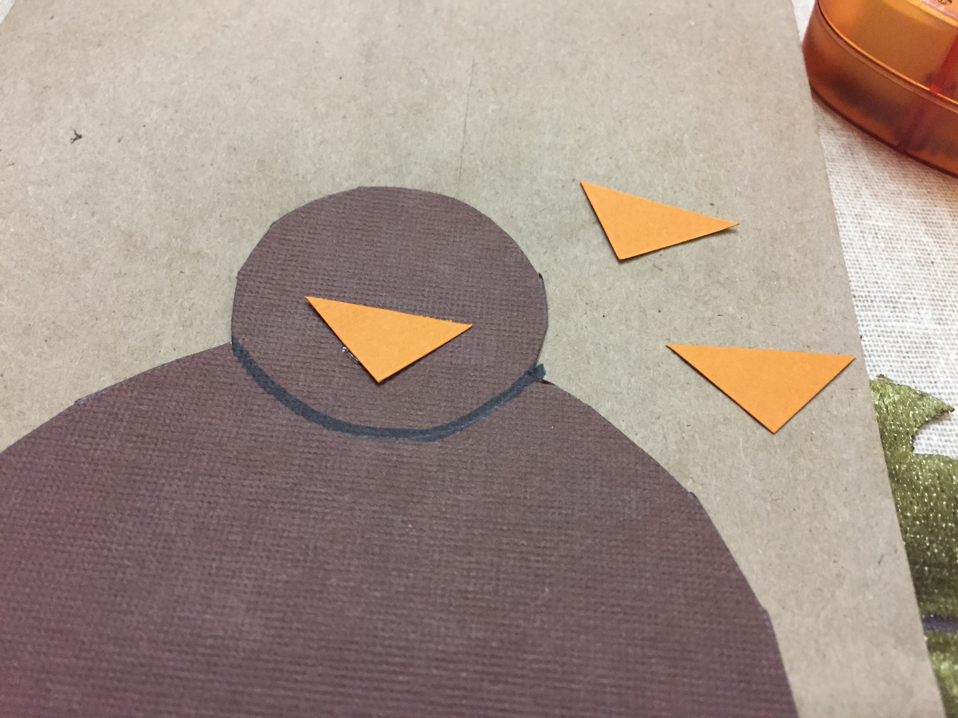 For the face, cut a small orange triangle for the beak and attach: