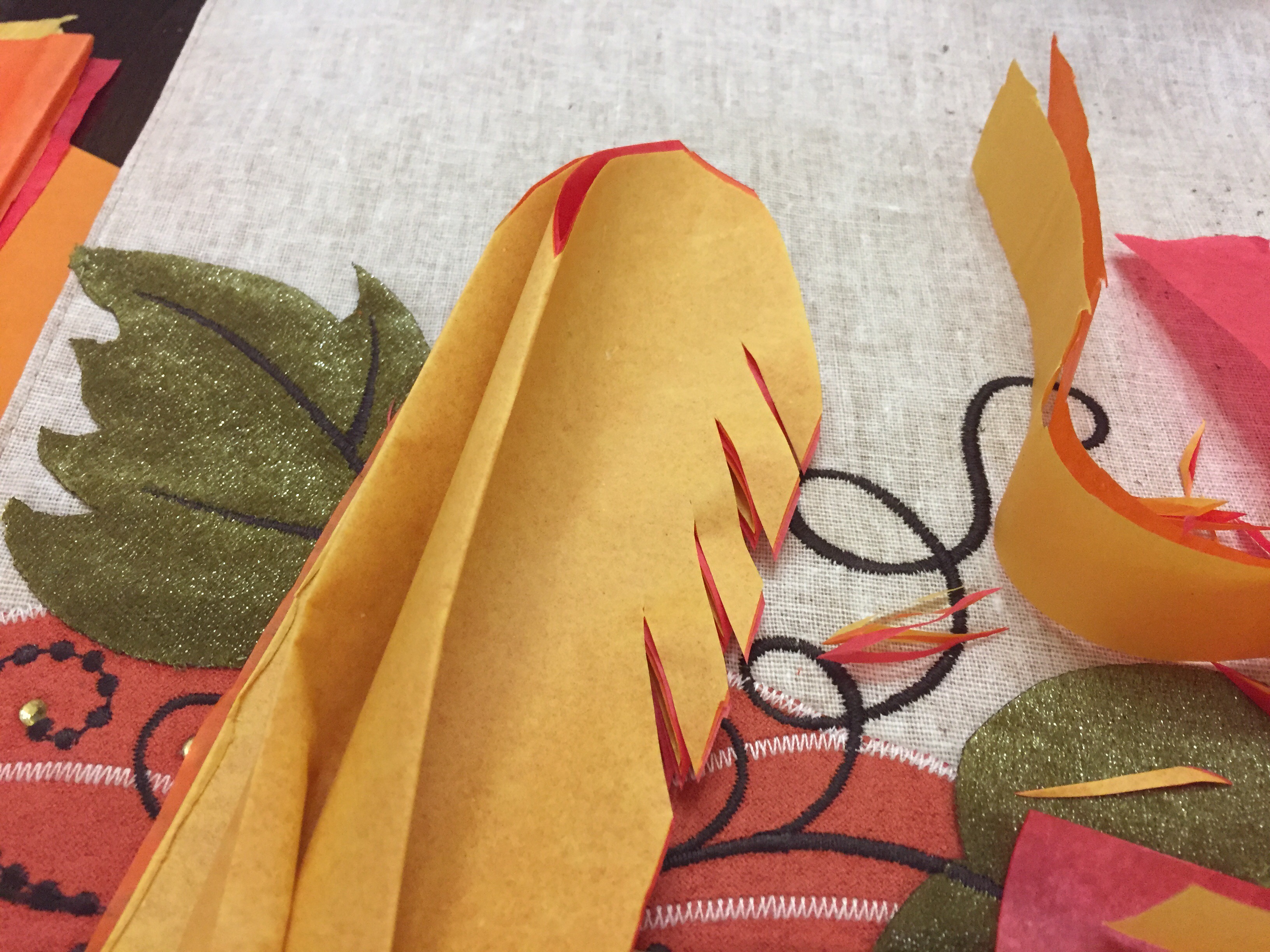 If you don’t want to do all that folding, use the THIRD method: cut out feather shapes, arrange them, and then attach them to the turkey. This takes more cutting, but it is definitely the simplest way to do it. You can see this method on the paper bag turkey.