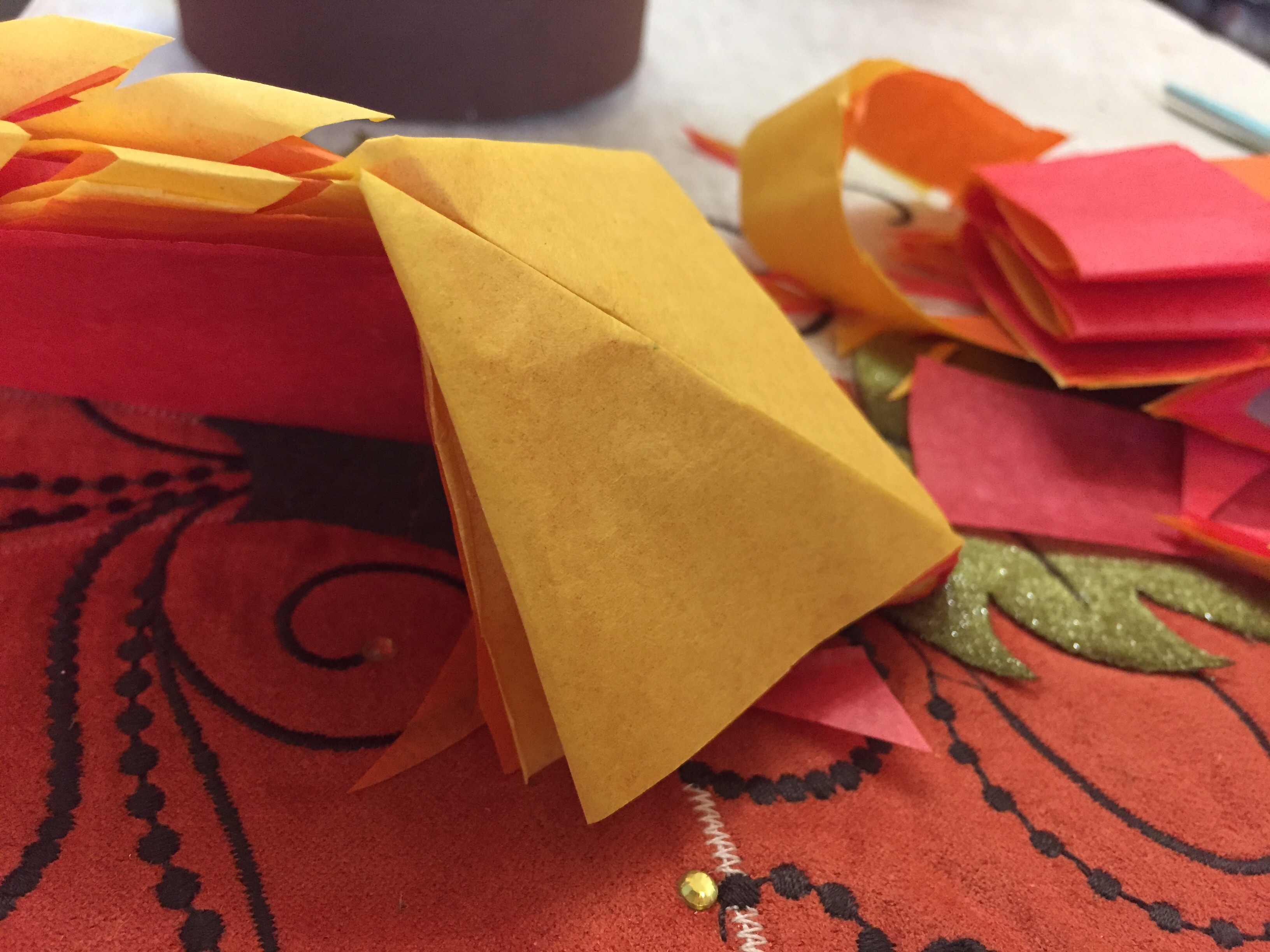 3. Adjust the paper in the stack as you see fit. I wanted to see all the colors, so I moved the orange down lower than the red, and then moved the yellow down lower the orange. Once they were arranged at heights I liked, I stapled them shut and trimmed off the bottom edge, leaving some folded paper below the staple for the next action.