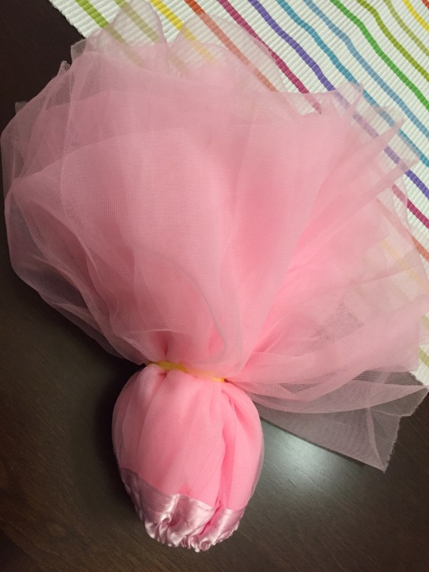 Here again you can get creative with your decor. For instance I used one of my daughter’s tutus as a flower. I rolled it up, wrapped a ponytail holder around the base, fluffed the top, and stuck it in a container. Easiest decoration EVER.
