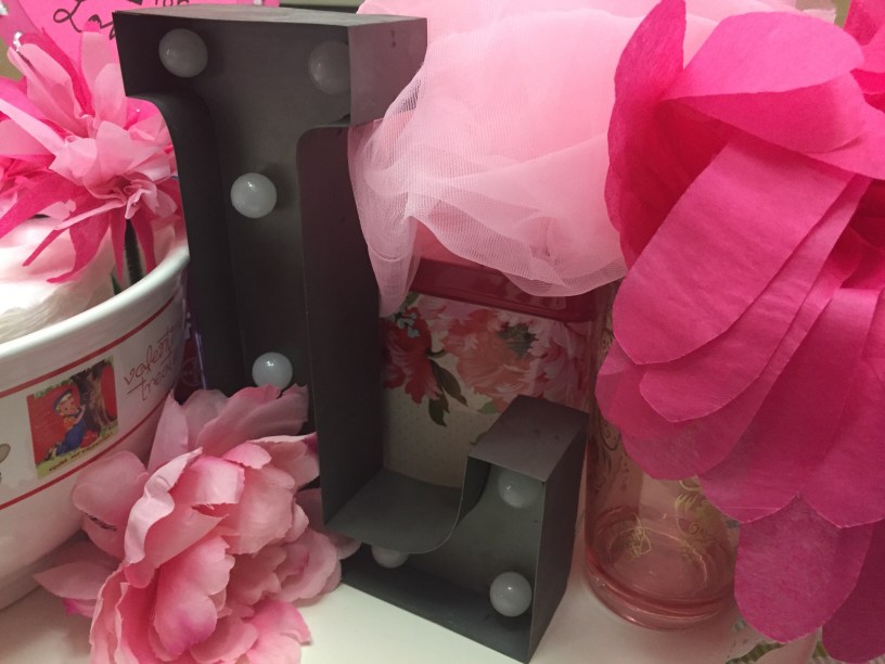 If you follow my blog already, you know I loooove tissue paper flowers. Affordable and easy! I made a few in different shades of pink, styles, and sizes. Stay tuned for a blog on how to create tissue paper flowers. And, um, for the flowers that didn’t turn out so well… we’ll save those for my OOPS blog. Heh heh.