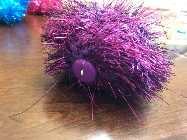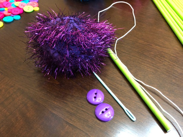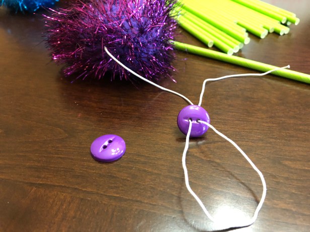 Step 3: Take the twine off the tapestry needle and thread it through a button. This is to help keep the twine looped through the pompom and not accidentally slide back through. Think of it as a stop-gap!