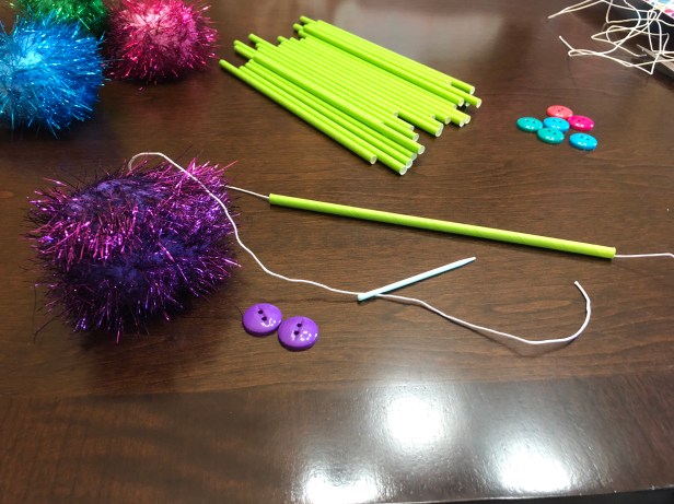 The basic concept behind these trees is that the straw is the tree trunk, the pompom is the branches and leaves, and the buttons and twine hold it all together.