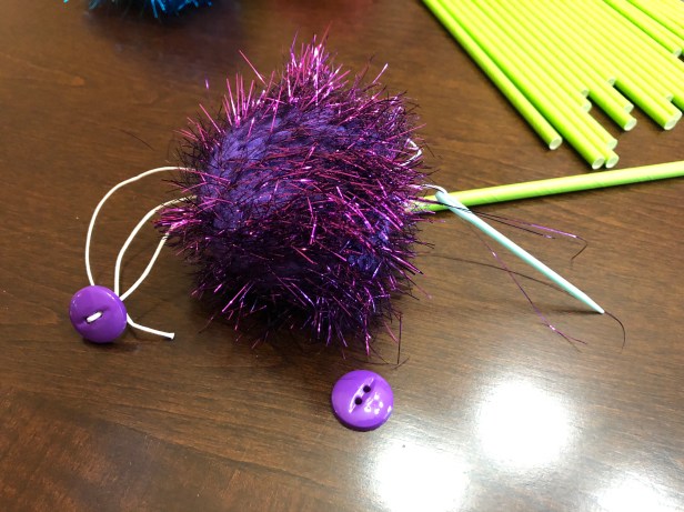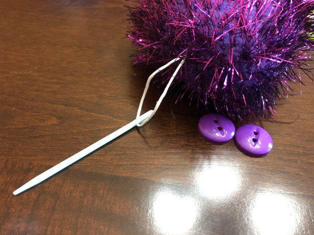Step 2: Thread the twine through the tapestry needle and use it to pass the twine through the pompom and out the other side.