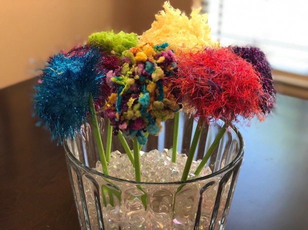 Now that your Truffula trees are ready, assemble them in a vase with filler (aquarium gravel, marbles, acrylic gems, etc.) to hold them in place. Arrange, admire, and pat yourself on the back for turning some supply scraps into a beautiful statement on Earth Day. You might want to keep these up year-round… or at least keep them handy for your next Dr. Seuss party!