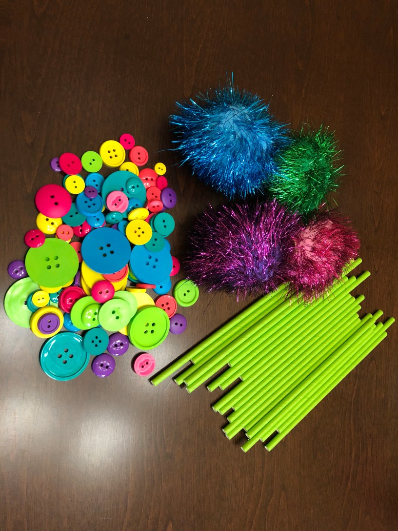 An alternative to pompoms and paper straws is tissue paper and plastic straws. You would still get the variety of color, and you could use the tissue paper to make different styles of trees. Just a tip: don’t put a yarn pompom on a plastic straw. They aren’t as strong as the paper straws and can’t hold the weight.