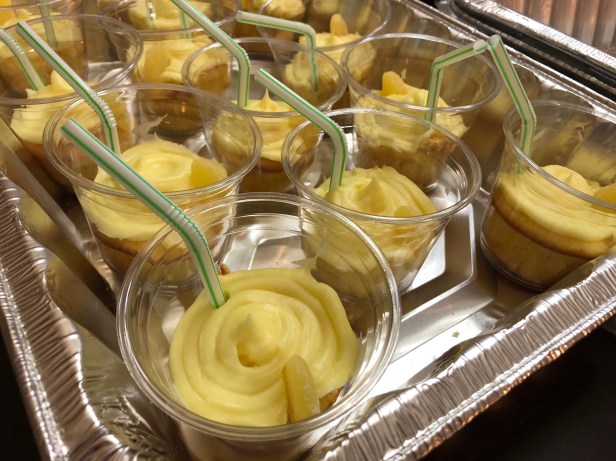 If your cupcake has a foodie or creative theme, consider serving them in something other than just liners. Below we placed lemon cupcakes with lemon frosting in short plastic cups. After adding some trimmed-down straws and lemon candies, we served our “lemonade” cupcakes with a spoon for easier scooping.