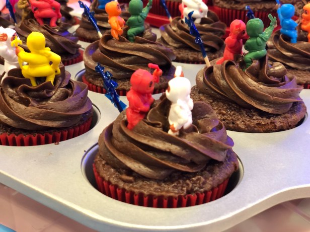 Maybe your cupcakes are sweet enough that you don’t need more candy decorations. You can have some fun and add TOYS to the top! This works best with smaller toys that are food-safe, like our miniature, plastic ninjas battling it out on top of chocolate cupcakes. The bonus here is that the cupcake recipient walks away with a happy tummy AND a toy.