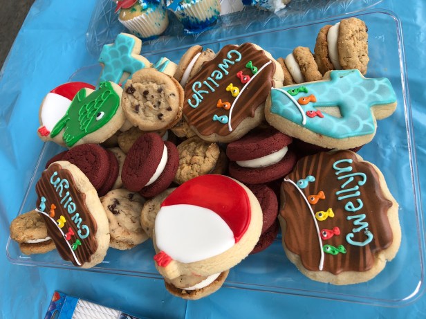 Some people prefer their sweets crunchy, and Clarissa had that covered as well. Knowing her time was limited to the tasks already at hand, she ordered custom cookies to match the theme (fish, bobbers, etc.). She then filled in the selection with a variety of sandwich cookies in chocolate chip and red velvet. YUM!