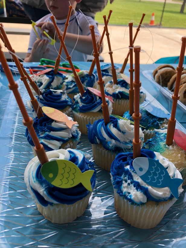 Our industrious and creative parent Clarissa captured the adorable theme of fishing in a number of small ways that added up to a big impact. For birthday sweets she went with cupcakes, swirling blue and white icing to mimic water. She then topped them with small plastic fishing rods already loaded with assorted fish in the party’s theme colors of blue, green, orange, and red.