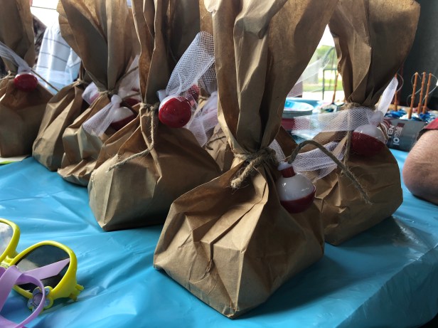 Favors were also dolled up in just the way you would expect: a brown paper bag reminiscent of packed lunches to be eaten while waiting for the fish to take a bite. Twine, tulle netting, and a small red and white bobber tied it tight so the goodies inside wouldn’t fall out. The bright red and white really popped against the calm tan of the bag.