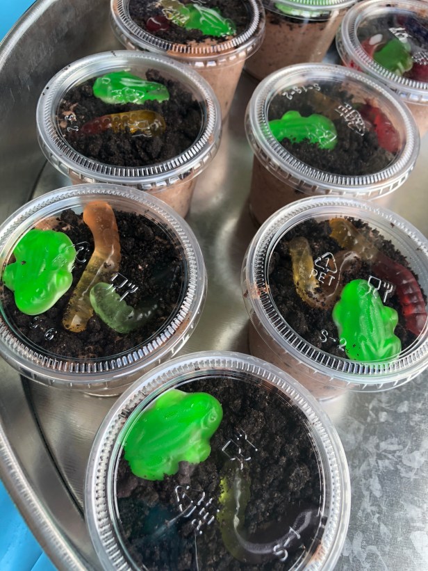 Just in case anyone still had the munchies leaving the party, Clarissa sent them home with their own kid-friendly treats: chocolate pudding and Oreo crumbs for dirt and gummy worms and frogs wriggling their way to the surface.