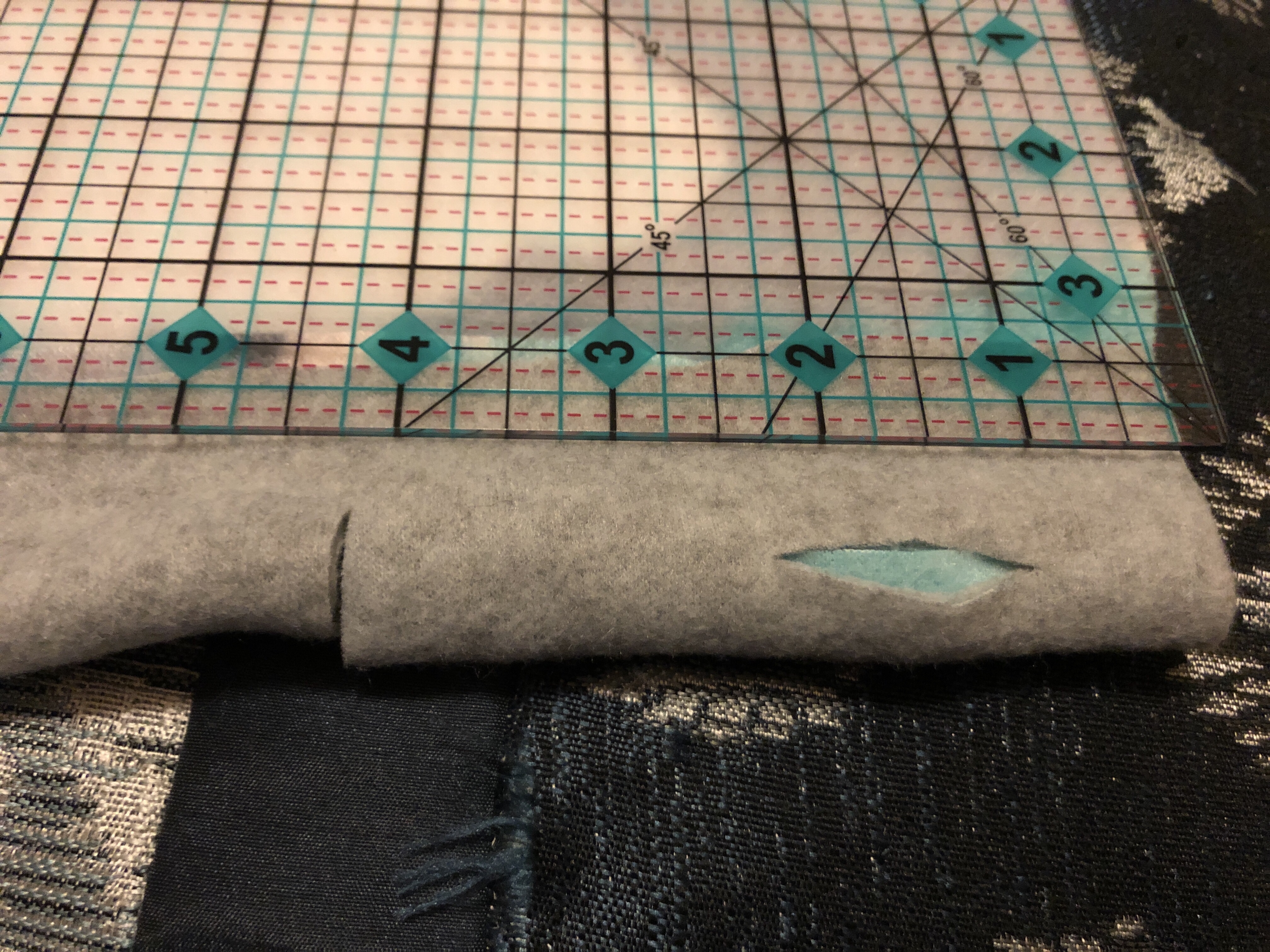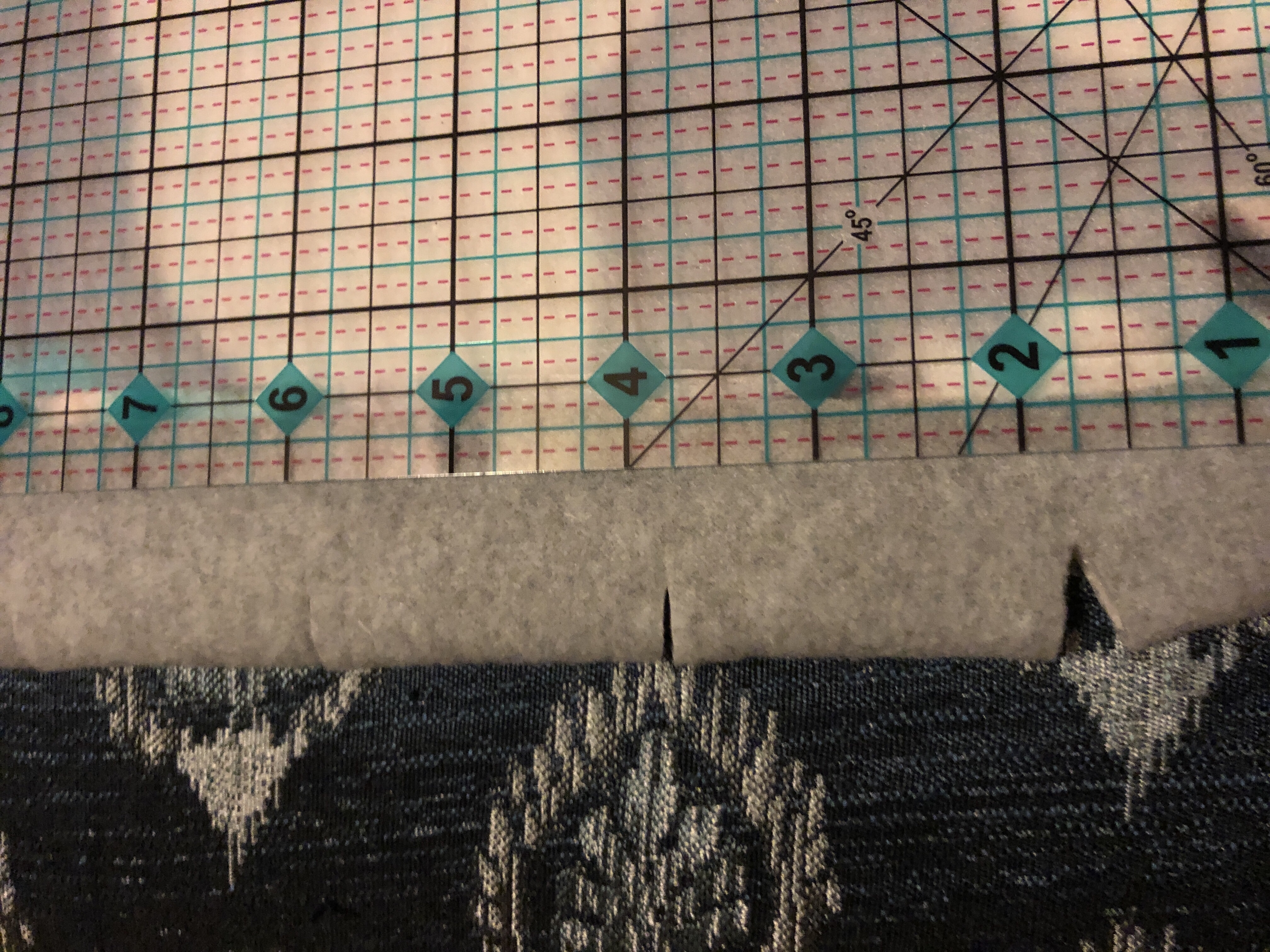 On the other side, look for those same holes and cut down the line of the holes there, too. (This is where you’ll have evened up your fabrics if they were different widths.)