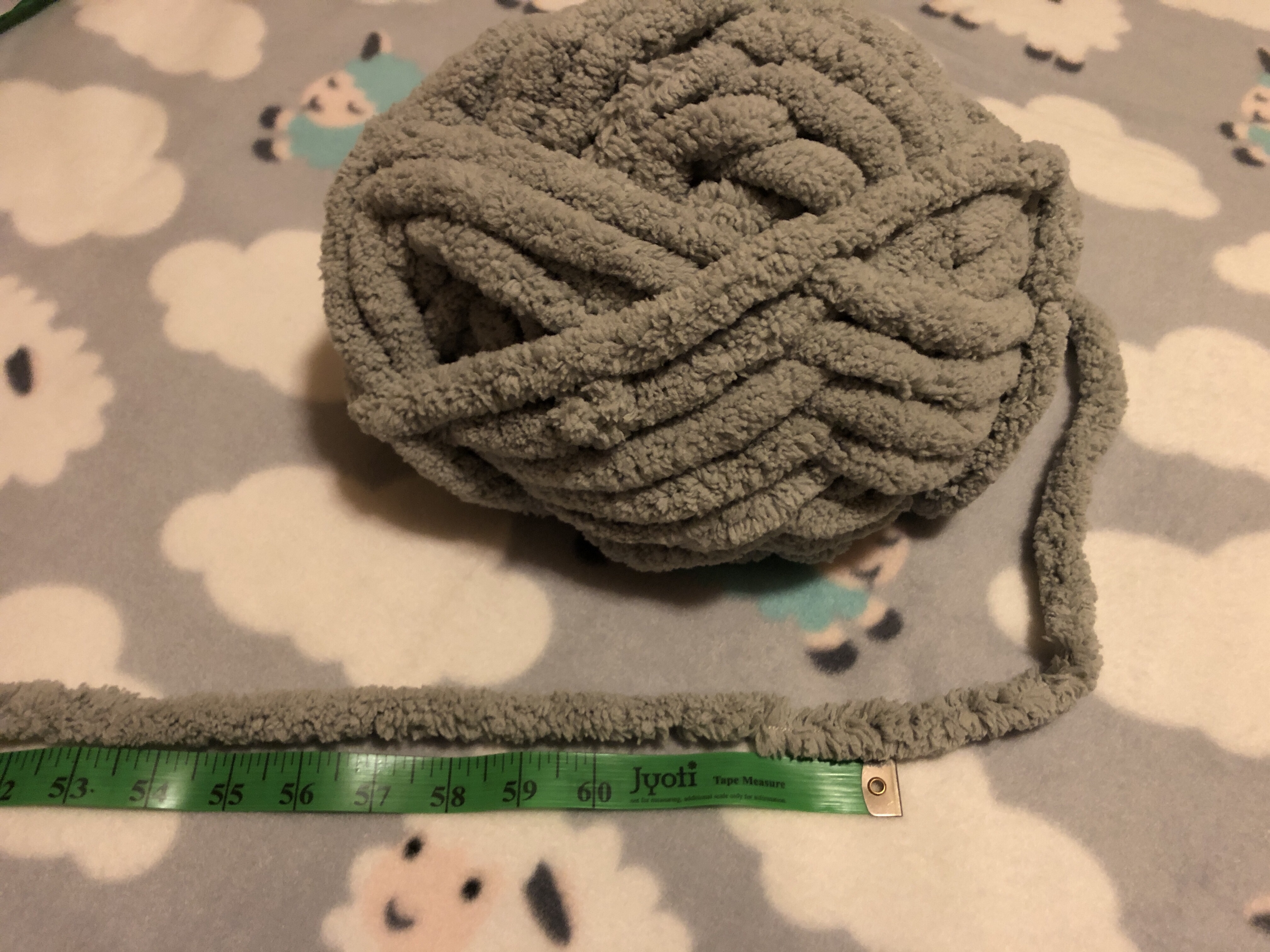 7. Measure out your yarn / ribbon so that you have enough to go along all three sides twice and a little extra. For instance, the blanket shown here was 50″ by 60″, so that would be (60″ + 50″ + 60″) x 2 = 340″ with some extra ended up being about 400″. (That sounds like tons, but it’s really just 11 yards of yarn. Less than one ball in most cases!)