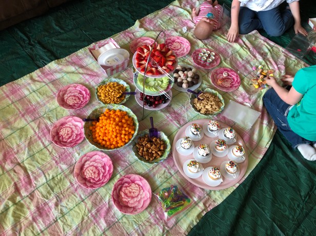 At our party we relocated the living room coffee table to another room and made sure the remaining furniture was pushed as far back as possible. We then laid down cheap, green vinyl tablecloths to mimic grass and protect the underlying carpet for stains (we found these tablecloths at a thrift store). A pastel plaid tablecloth went on top to act as our picnic blanket.