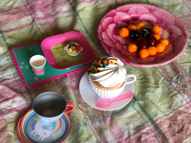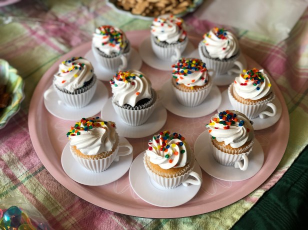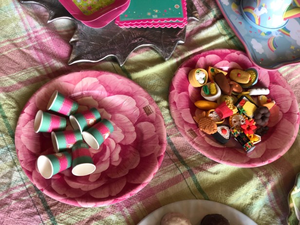 We wanted our guests to feel their dolls were guests at the party, too, so we pulled out multiple play tea sets and combined them with doll-sized paper plates and paper cups we found on Amazon. Doll-sized food can be pricey, so we came up with an alternative solution: a variety bag of food erasers, also from Amazon. They were the perfect size for the dolls, and the kids had so much fun digging through them and “serving” their dolls. Because they were so cheap, we were able to let our young guests take home a few each as party favors.