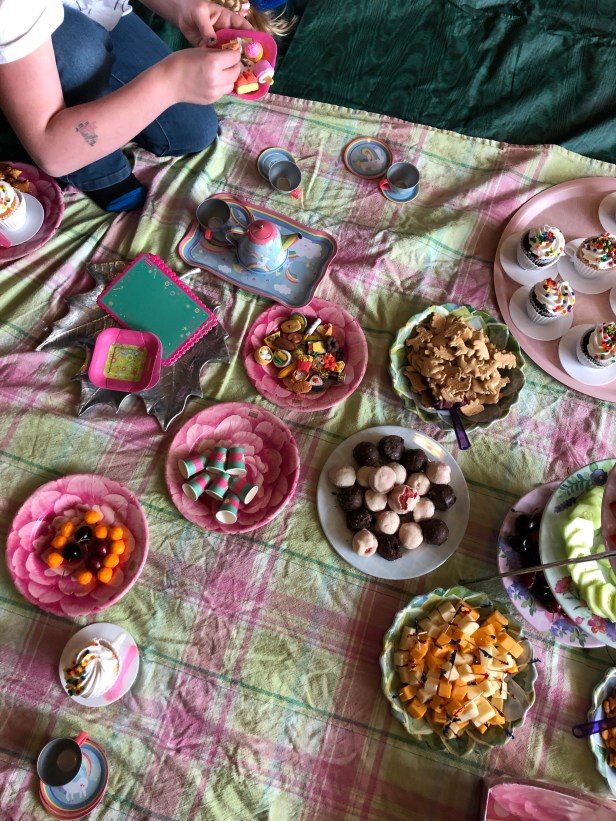This particular indoor picnic had an additional element: doll tea party. We invited all of our young guests to bring their favorite doll and tied in some of the party elements to the dolls. The kids had so much fun introducing their dolls to everyone and incorporating them into the activities. It was pretty adorable.