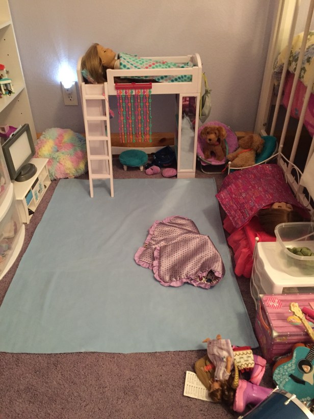 The activities didn’t stop there! We had some fleece scraps left over from a previous project (see DIY Convertible Fleece Blankets), and arts & crafts are always popular at our parties for younger guests. They got to dig through the scraps to find the ones they liked best (there may have also been jumping in fleece piles, but we’re not telling) and – depending on their age – cut them into different doll-sized accessories. These included:
