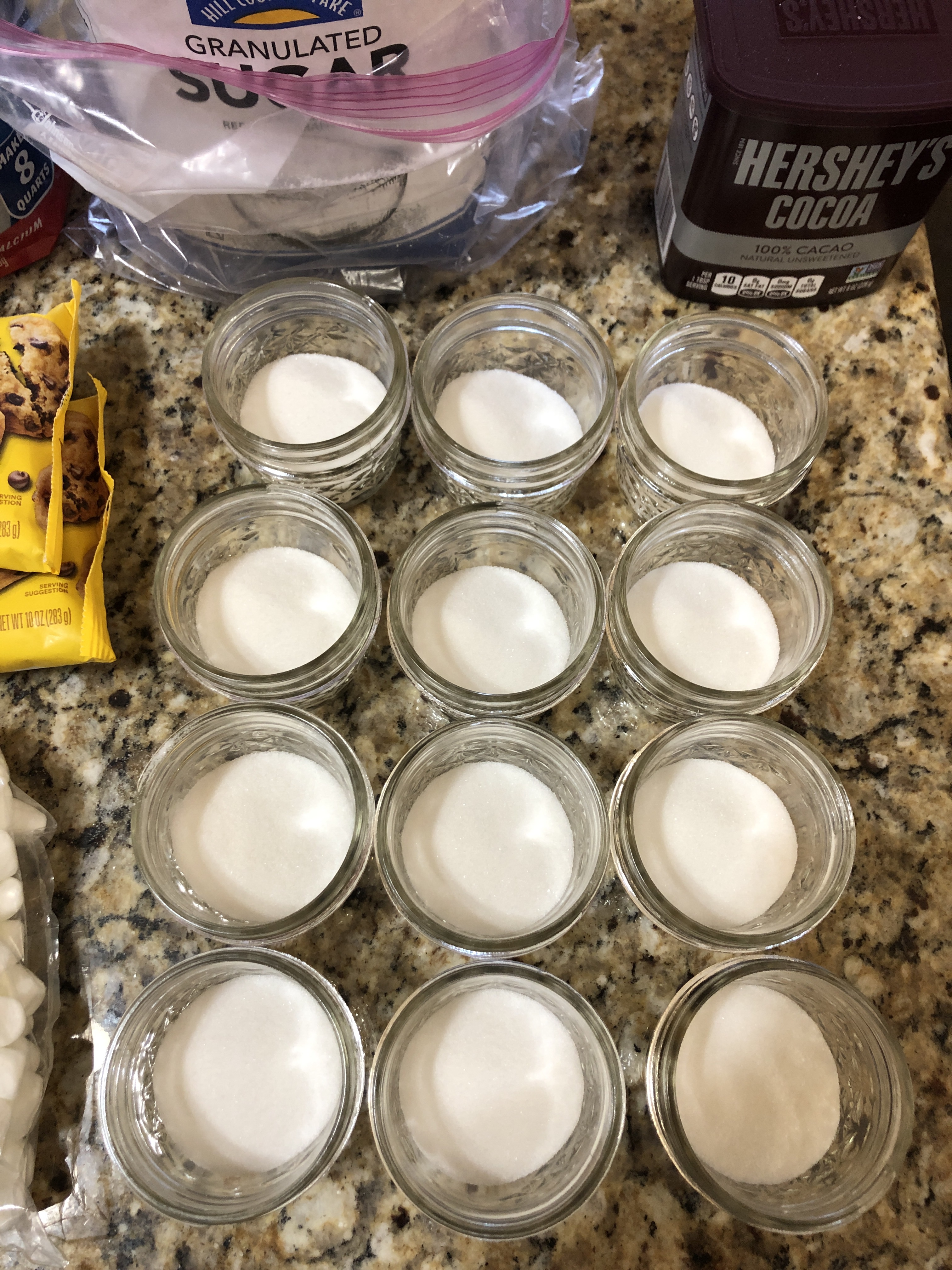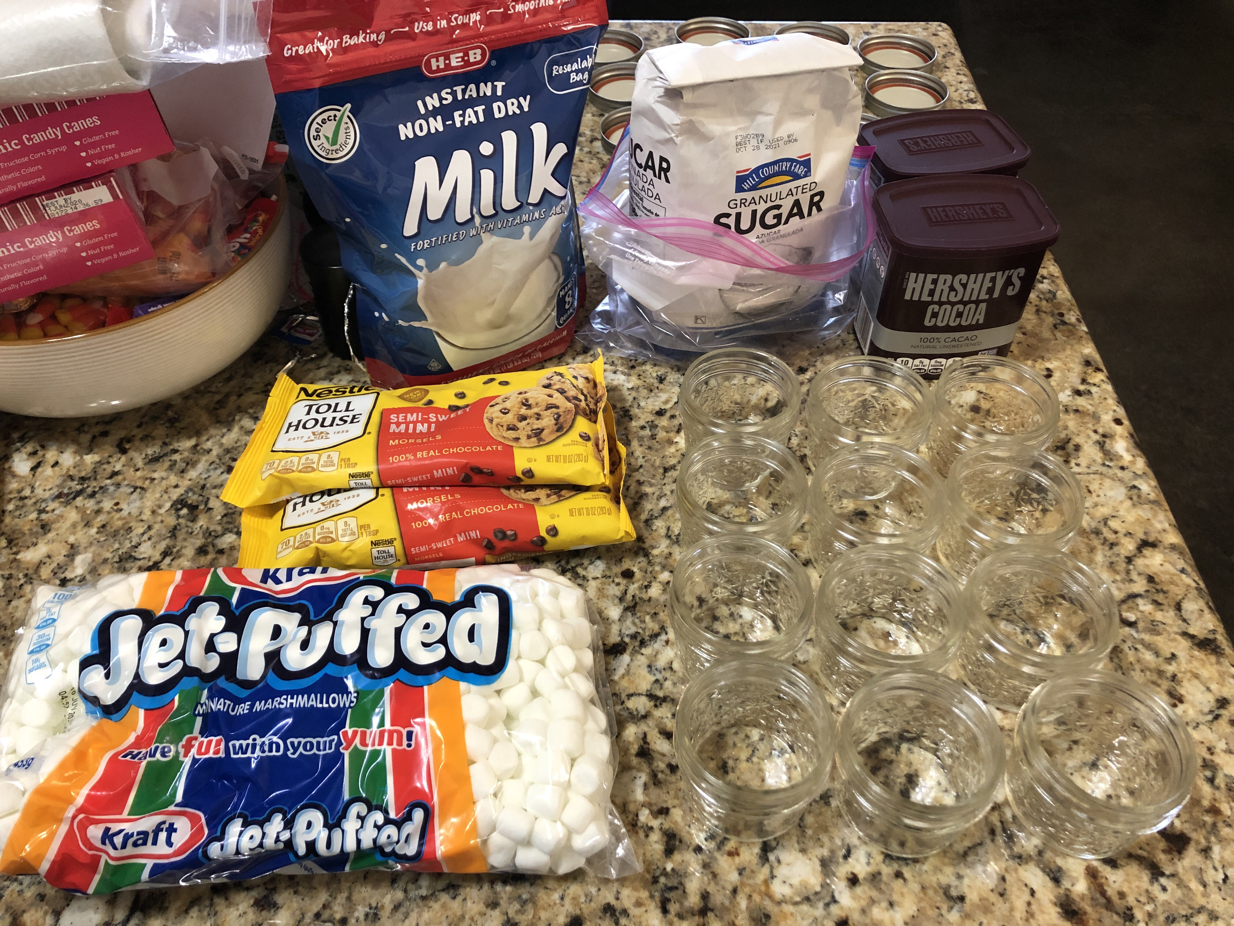 NOTE: While we initially included chocolate chips, they left a chunky residue at the bottom of the mug that was unappealing. We’d recommend leaving them out or reducing the amount. Also, our 4 oz. jars were too small to hold the mini marshmallows, so we included them in separate snack-sized bags with the jars.