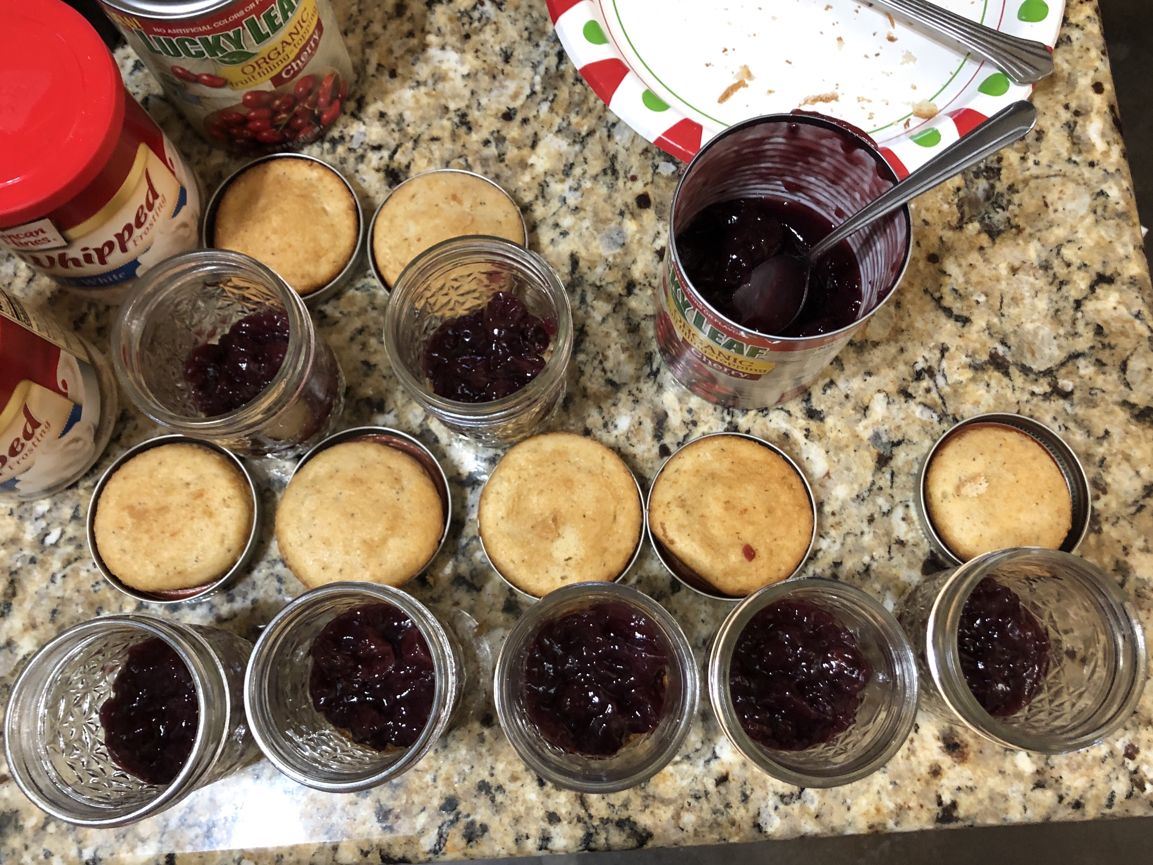 STEP 3: Add 1 – 2 tablespoons of pie filling to each jar, just enough to cover the cupcake.
