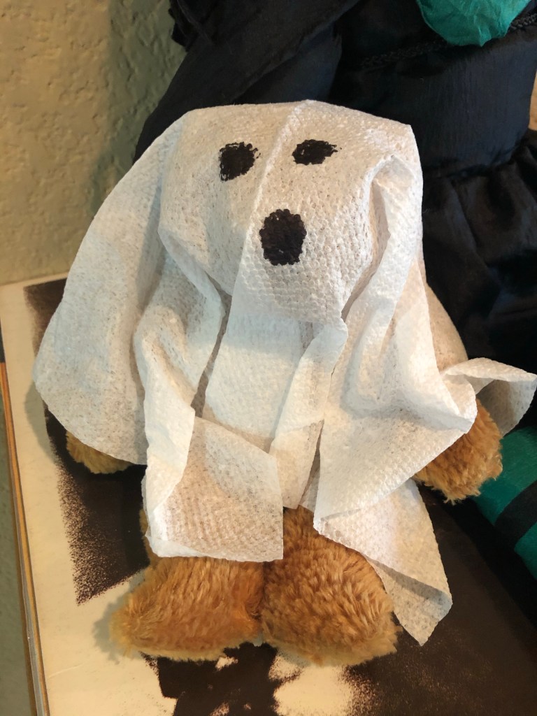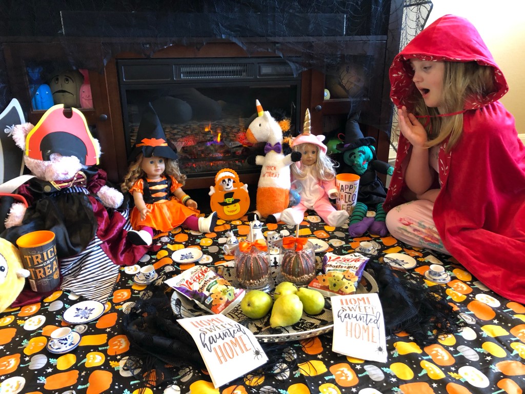 TIP: If your child has their heart set on trick-or-treating, you can place the costumed toys around your home with small treat bags. Then the dolls and animals become the neighbors handing out treats and admiring their costume!