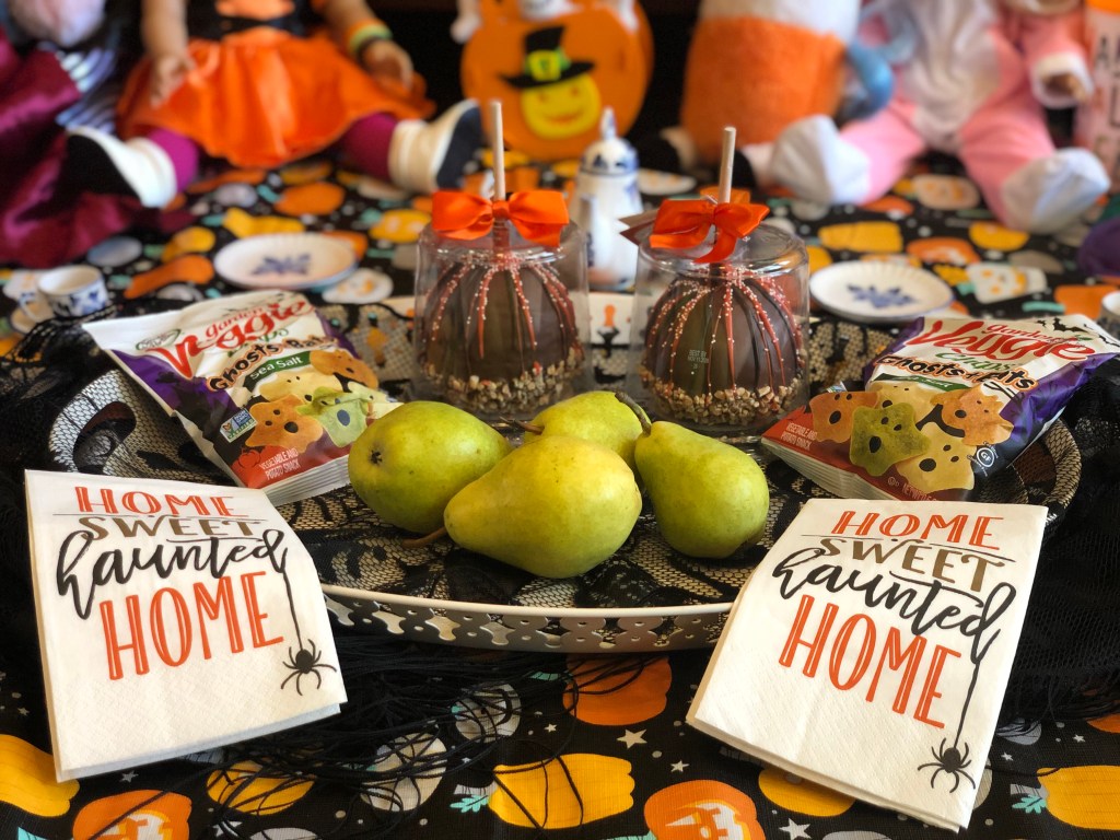We also like to play up tea parties with any special treats that they wouldn’t normally get, such as specialty chips or, in this case, chocolate caramel apples. Arranging them on a plate can lend an air of festivity to any boring old thing! And remember: treats at Halloween don’t have to be candy to be fun. My daughter loves pears, and some particularly juicy and sweet ones will always put a smile on her face.