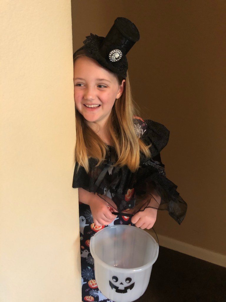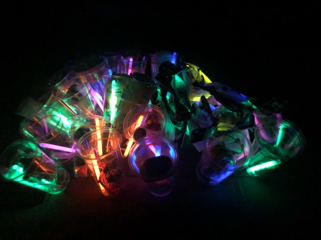 Because this is Halloween, we decided on a treat hunt where she could go “ghost hunting”! To do this, you can use either clear treat bags or clear plastic cups, glow sticks, and treats.